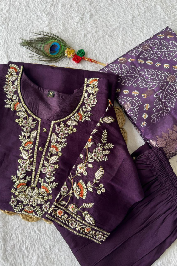 Magenta Premium Kurti Pent Dupatta Set Roman Silk Fabric